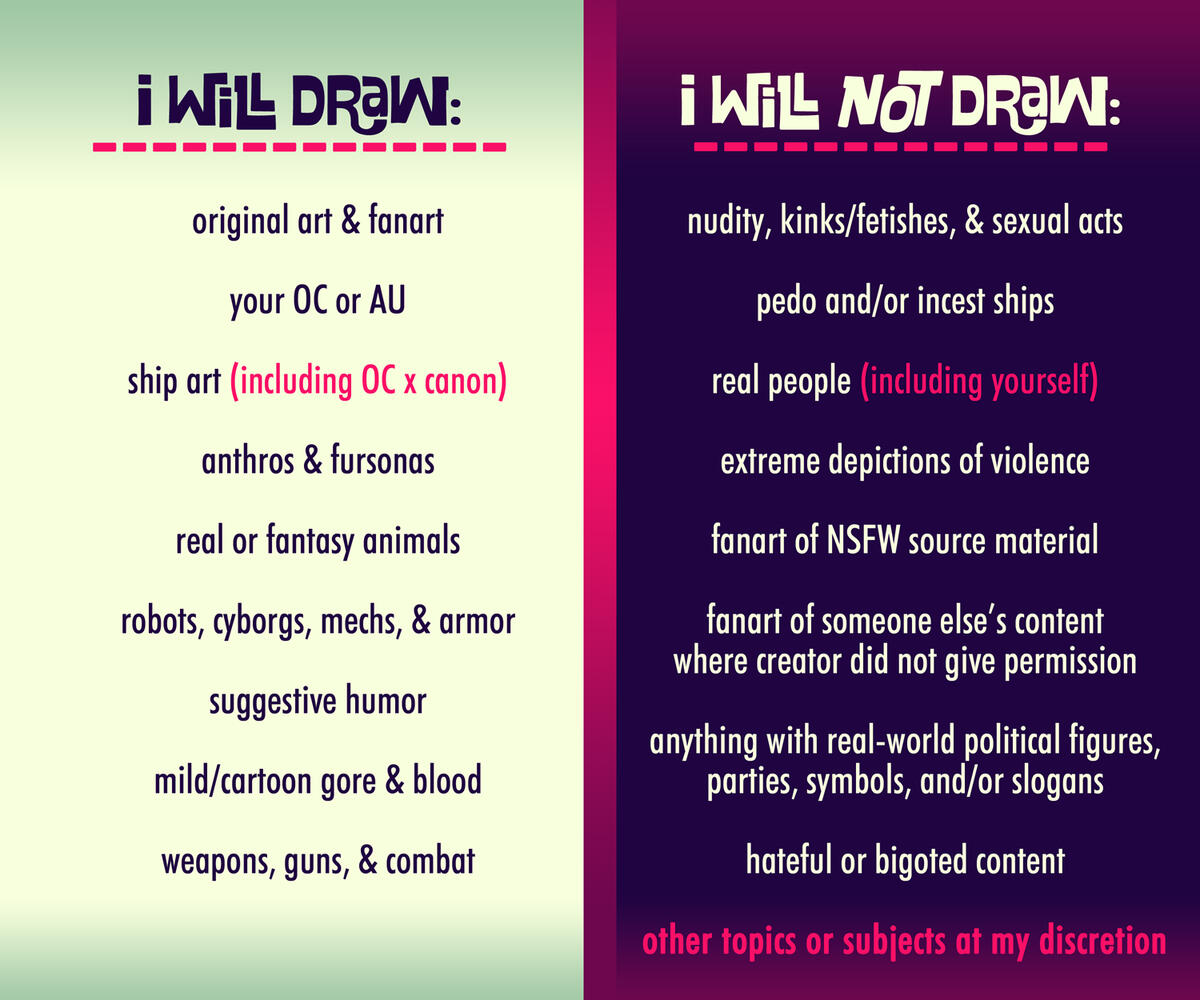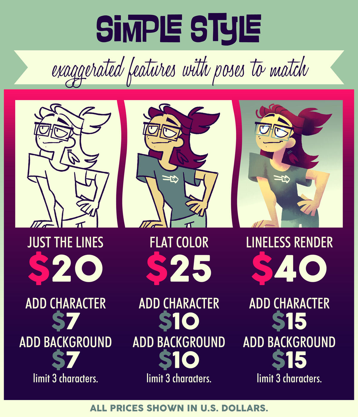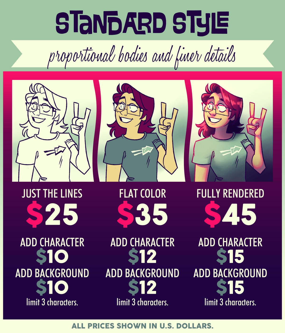 All prices are shown in U.S. dollars.After being completed, the commissioned artwork will be sent to the purchaser ("the client"), in .PNG format through email. Alternate delivery methods are available upon request. Once the commissioned illustration ("the work") has been completed and sent, the client may still request up to 2 minor edits to the commission for up to 3 days after receiving the file.I reserve the right to refuse a sale for any reason. Commissions may be canceled by the client at any time for a full refund until piece is completed and delivered via email. The client may use and reproduce the work for personal and educational purposes, including personal (i.e. non-business) social media icons and/or headers. The client may not use the work (in whole nor part) for business purposes (ex. official signage, websites, business cards, etc.), reproduce it with intent to sell (ex. manufacturing prints or apparel featuring of the work), incorporate it into a larger creative work (ex. book covers, music album artwork, etc.), or profit off of it in any way unless otherwise specified and agreed to in writing prior to submitting payment. The client may not edit or modify the visuals or text within the work (such as using image-editing software) in a way that violates aforementioned subject limitations (ex. overlaying political slogans or logos/iconography).I reserve full legal ownership of the work and may use, reproduce, and edit the illustration in whole or part indefinitely.By commissioning me you agree to these terms.